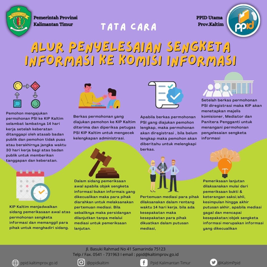 Sengketa yang terjadi antara badan publik dan pengguna informasi publik yang berkaitan dengan hak memperoleh dan menggunakan informasi berdasarkan perundang-undangan. Komisi Informasi Kalimantan timur adalah lembaga yang berwenang menyelesaikan Sengketa Informasi Publik melalui mediasi dan/atau ajudikasi.