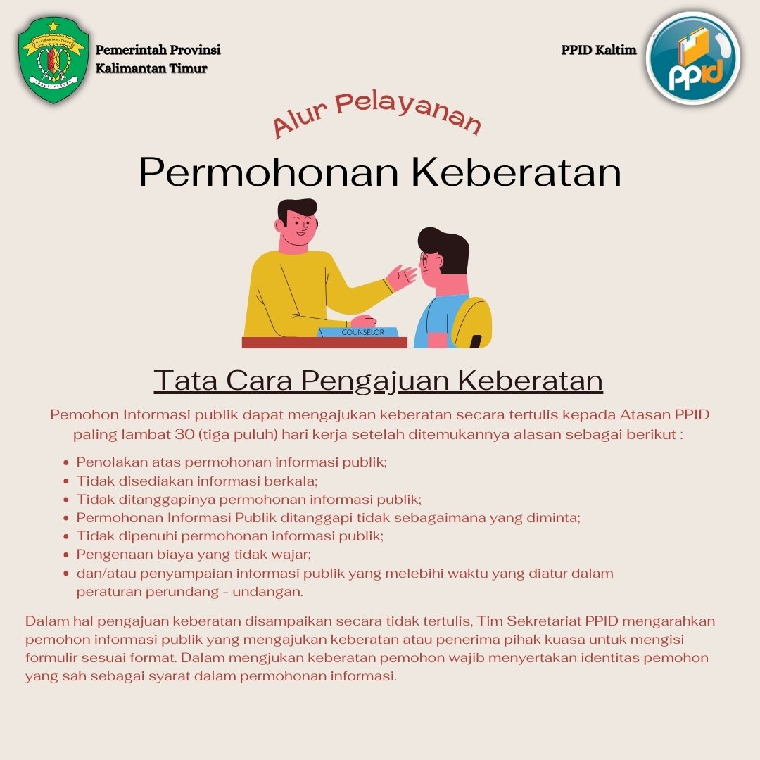 Pemohon informasi publik dapat mengajukan keberatan secara tertulis kepada Atasan PPID paling lambat 30 (tiga puluh) hari kerja setelah ditemukannya alasan sebagai berikut: